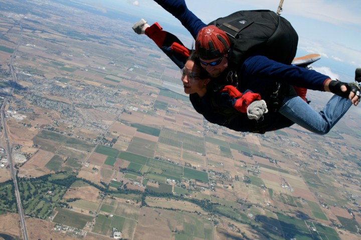 Heck yeah, babyyyyy! This is something I’ve wanted to do for years. It’s not like I’m not afraid of heights either. I’m terrified. But jumping out of a plane, from 13,000 feet at 122 mph (well, my tandem master said we were actually going closer to 110 mph because I was too light) was just something I had to do. Steven was on board so we went with two friends, April and Graham, and had the times of our lives. I was the first to jump and wasn’t given a second to rethink my decision. Bud, my tandem master, scootched (?) me up all the way to the edge and the last thing he said, “Don’t hit your head on your way out. It’ll hurt like hell.” And before I knew it, we were freefalling. When I post more pictures, you can see ICICLES on my nose. It was FREEZING … -13º!! I loved every second until Bud released the parachute and as we were calmly descending, he realizes Steven (who jumped after me) was already passing us so in order to “beat him”, he yanked on the parachute and sent us SPIRALING down for a good 5-7 seconds. I nearly threw up. Screaming for him to stop. When we finally stop, the whole way down I was preparing myself (and him) for my impending projectile of vomit. Luckily, we made it down, very smoothly, but I was struck with nausea for about 20 minutes.